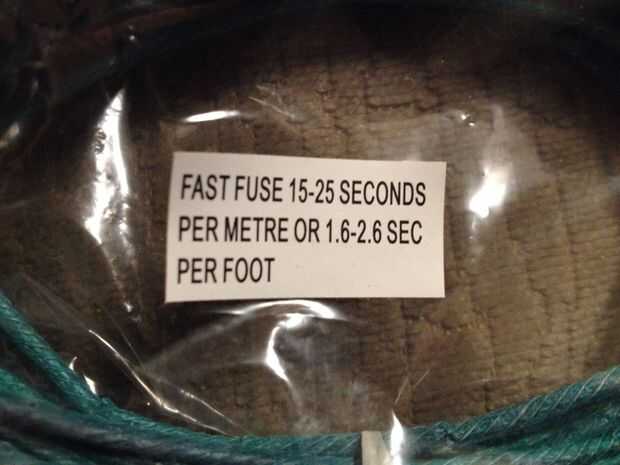 Usted puede obtener seguridad o fusible de Visco en muchas velocidades, los que considero más útil son 2 segundos por pie y 30 segundos por pie. Usted tendrá que averiguar la velocidad del fusible que puede muy en cada lote. Cortar una longitud, luz y cuánto tarda en quemar, ten cuidado con aunque como puede latigazos y sobrevolar todo el lugar, también sabemos que el tiempo que tarda el fusible en el fuego para quemar antes de que enciende el tiempo.