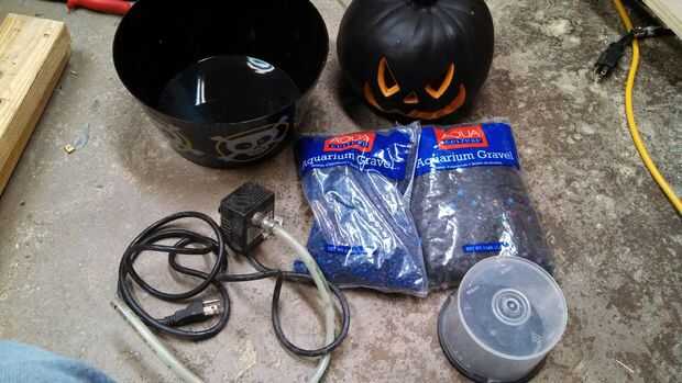 Necesita algunas cosas para empezar: un recipiente grande, una bomba pequeña fuente con un tramo corto de tubo y un pequeño recipiente de plástico. Usé una bomba vieja de que tenía que poner alrededor y un huso de CD viejos. Recuerde que el recipiente debe ser suficientemente grande para contener la bomba, pero suficientemente pequeña para caber en el recipiente. Hará cualquier recipiente, pero encontré que el eje CD agrietados fácilmente cuando se perforó en el paso siguiente. También se necesita algún material de relleno. He usado piedra de acuario, pero se puede utilizar casi cualquier cosa. Se puede utilizar arena, pero debe tener cuidado adicional para asegurarse de que no es ingerido por la bomba. Por último, usted necesita la calabaza. La utilicé fue plástico moldeado soplo hueco con una luz en la parte posterior. Por último, necesita algo de sangre. Muchas tiendas venden sangre falsa en botellas grandes, pero no va a utilizar demasiado. Sangre falsa a menudo es muy viscoso y pequeñas bombas de fuente pueden no gustarle. Diluye mi sangre falsa con agua.