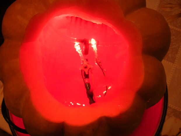 Como workind como lo planeado era el momento de la pintura. Rojo era la elección perfecta para los LEDs porque la calabaza se supone que es espeluznante. Necesitaba 4 leds - 2 en la calabaza y 2 en el agua. Que iban a ser mojado por lo que cuando yo he soldado los cables he cubierto les con silicio.
