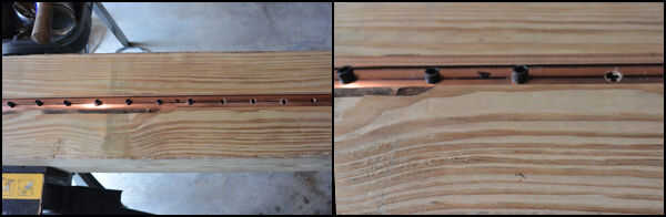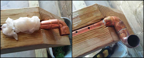 Las conexiones de la soldadura. Tenga en cuenta que tenemos puesto un trapo empapado en agua fría en la tubería, unas pocas pulgadas de la conexión. Esto evita que el tubo se enfríe lo suficiente para evitar daños en la madera mientras se suelda. A continuación, tomar ¼" línea de goteo Toro raya azul y cortar ½" piezas. Insertamos un trozo en cada orificio de la tubería de cobre. Esto es importante, porque la tubería hace que el agua fluya hacia abajo. Sin ella, el agua fluye en direcciones irregulares.