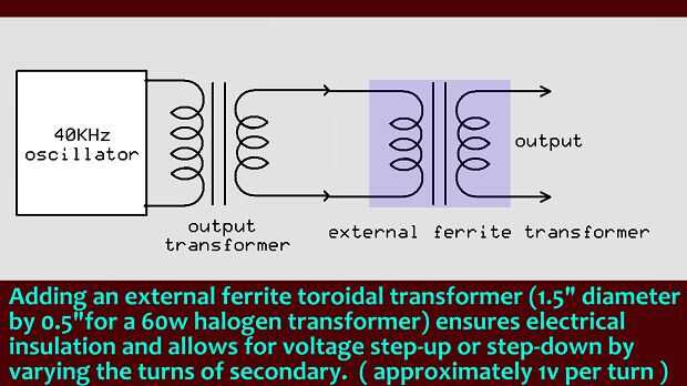 Mediante la adición de un externotransformador de núcleo de ferrita (toroidal o EE) garantizamos aislamiento total y seguro de la tensión de red, bobina primaria lleva sólo 12 vueltas. Devanado secundario/s requieren solamente alrededor de 1 vuelta X voltios salida. De esta manera que podemos elegir el voltaje de salida que necesitamos sólo agregando o quitando unas cuantas veces. Descender, paso y la salidas múltiples para fuentes de onda completa o split. Utilice el cable eléctrico de 1mm 2 con aislamiento. Material de la base debe ser de ferrita y polvo de hierro no .