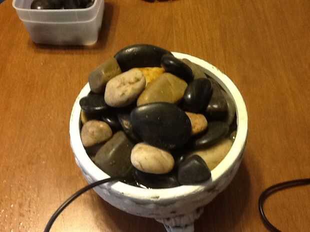 fuente de agua caseraHola, esto me tiene inspirado para hacer algo para la primavera...Materiales de...Plantador de la flor con orificios de drenaje NO u otro recipiente sin los agujerosRocas o piedras (yo usé los grandes y pequeños)Pequeña bomba de