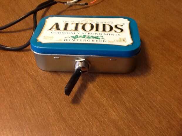 Primero tenemos que conseguir el interruptor en el recipiente para que se haga un orificio en la parte para colocar el interruptor. Continuación tendrá 2 orificios en la parte superior para poner los cables a través. He utilizado un recipiente de altoids así que tuve que lijar después de perforar.