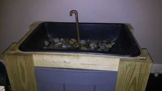 esta es una característica de agua cubierta constituida una vieja 'pecera' una bomba y otros artículos para el hogar:) y en mi opinión añade una agradable agua filtrado de sonido y algo 'bastante' para buscar en:)Ah y lo siento por el uso de im de tr