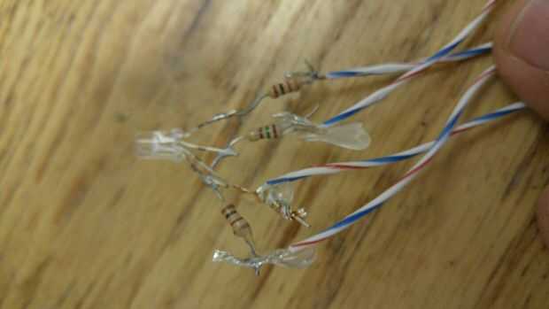 Además, queríamos que estos LEDs a desvanecerse a diferentes colores. Aunque tendría sentido para ellos para iluminar solamente cuando el bajo era alta, que les haría a parpadear rápidamente y no podremos ver el descoloramiento ocurren. Por lo tanto, hemos decidido que cuando se alcanza el umbral bajo, tres salidas proporcionaría un voltaje de.1 segundos. En ese momento, nosotros rápidamente cambiaría la cantidad de tensión en cada salida varias veces, haciendo que los LEDs cambian de color. La imagen muestra el cableado en la base de uno de los LEDs tri-color.