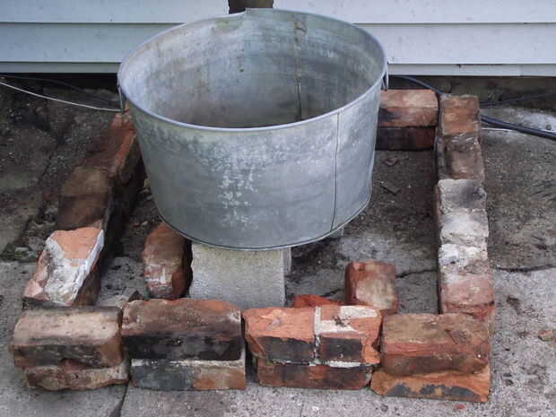 decidí ir con volver a reclamado ladrillos de la chimenea nos derribaron. Estas son de la parte inferior del cañón unos, no muy ideal para cada proyecto ya que algunos tienen algún mortero viejo y si usted intenta y limpia, se romperán, y otro de hollín sobre ellos, pero voy hacerlos funcionar. Me Coloque la bañera vieja y solo ojo-mirado todo como puse los ladrillos alrededor de alta dos apilados. Luego coloqué algunos ladrillos rotos en los huecos a cada lado de la tina para ser utilizado como relleno.