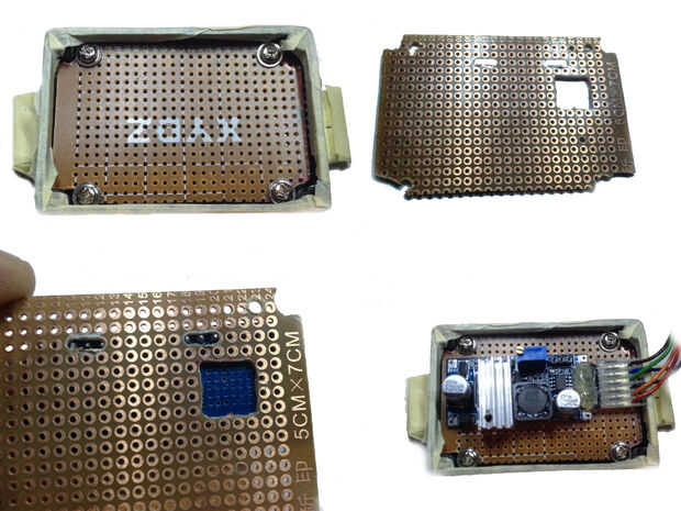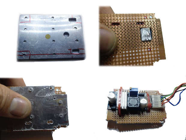 - Cortar la placa de aluminio con el tamaño de la caja y también cortar una esquina donde será el conector de entrada. Esa pieza se utilizará a nivel de las cosas (ver fotos) se mantiene la placa con unas bridas, agujeros adicionales va a necesitar ser perforados en la placa de aluminio y tablero.Antes de todo junto con las bridas de fijación, use poco calor de la pasta para ayudar a transmitir el calor al disipador de aluminio.