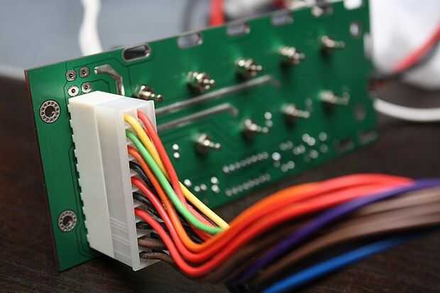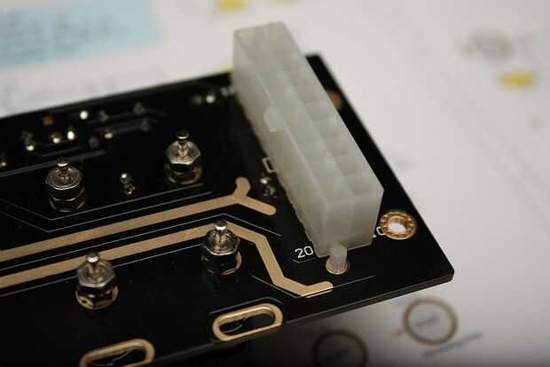El conector Molex-estilo (encabezado ATX) se monta en la parte posterior del PCB. La nueva versión (negro) de la PCB está codificada con el conector, así que usted no puede instalarlo el camino equivocado. ATENCIÓN - de hecho hay una serigrafía en la parte inferior de la PCB como guía. Una vez que estés absolutamente seguro de que usted tiene en la posición correcta (como se muestra aquí), soldadura en lugar de la parte frontal de la placa.