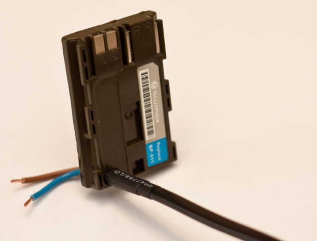 Ahora toma misures de la abertura que encuentra en su Canon. Es una pequeña puerta de goma que puede doblar para dejar el alambre pase a través. He encontrado que en apretón de la batería la abertura está en una posición diferente, pero si estás alimentando la cámara por un externo powersource probablemente no necesita el apretón de la batería. Así que he optado por la posición en la cámara.