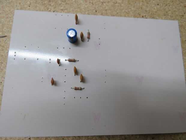 Condensador electrolítico de 100 μF. Colocar la terminal negativa del capacitor, como se muestra en la imagen. La terminal negativa de los capacitores electroliticos esta indicada con una franja de color diferente al color del resto del cuerpo del condensador. También puede identificarse porque la terminal es más corta la positiva.