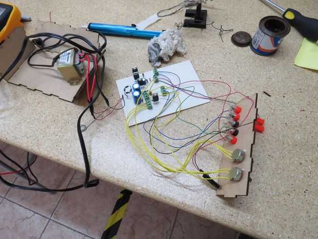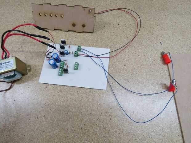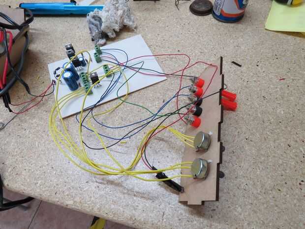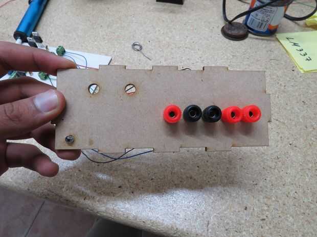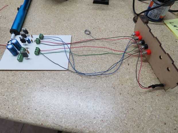 Es recomendable crear un código de colores para los cables se conectarán en los bornes. Este caso se emplearon los cables amarillos para los potenciómetros, el de negro para de un cable rojo y uno led indicador, cables azules para las salidas fijas de 5 y 9 V, cable rojo para la salida de voltaje variable positivo, cable verde para la salida de voltaje variable negativo, y cable negro para la tierra.
