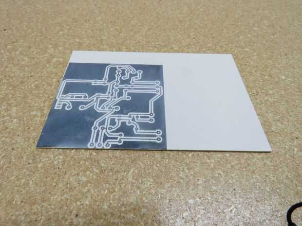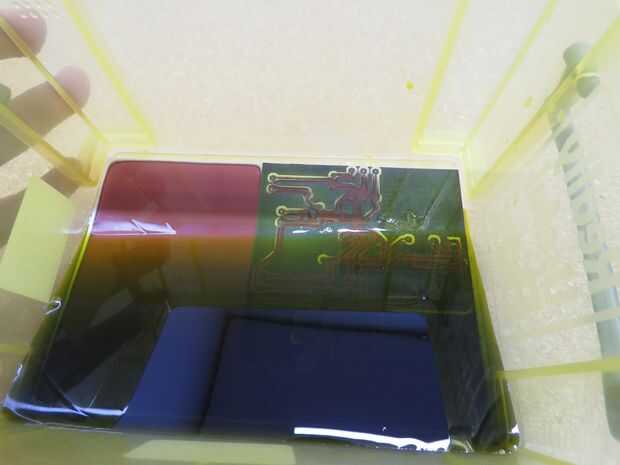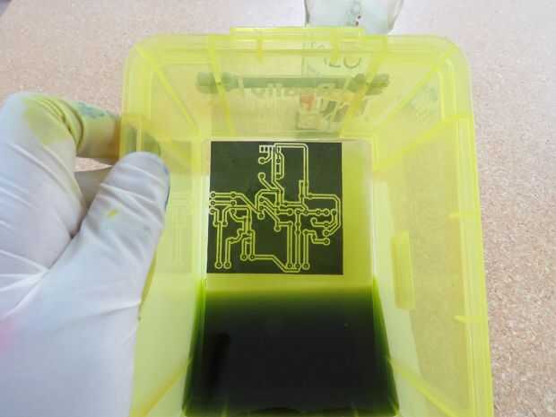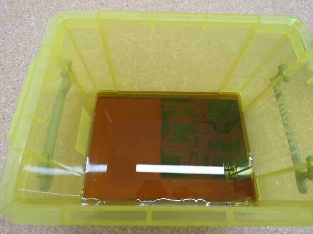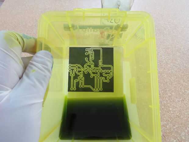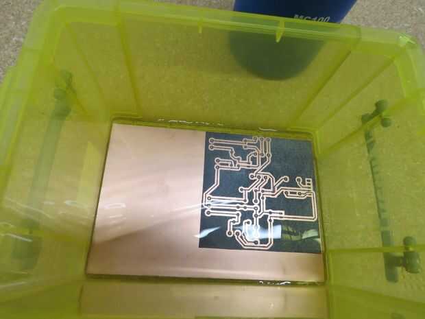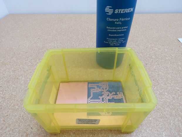 Coloca la placa en un recipiente con agua caliente y cloruro férrico. La solución de agua y cloruro férrico debe cubrir la placa. Deja reposar para eliminar el cobre sobrante alrededor de 5 a 10 minutos es importante monitorear el circuito para evitar se eliminen por completo las pistas del circuito. Al finalizar haber cobre sólo abajo del papel de color gris o negro que protégé las pistas del circuito.