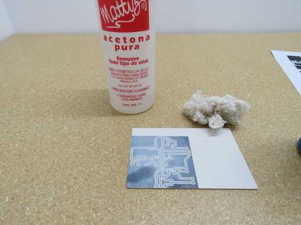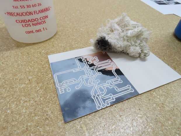 Lava con agua la placa y limpiar con estopa o algún pañuelo con relacionados para retirar el tóner y dejar sólo el cobre limpio para poder soldar.