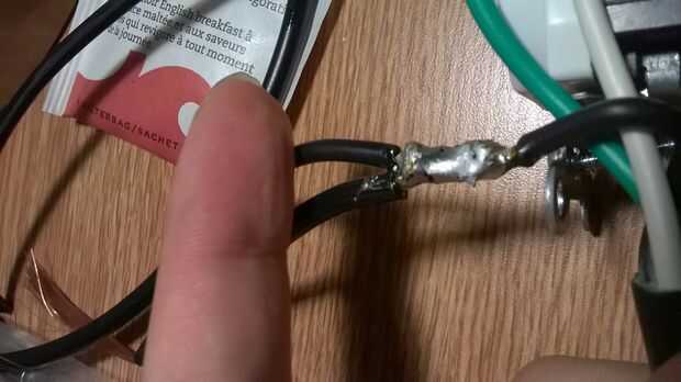 . A unos 5 cm desde el extremo del cable vivo (negro en nosotros), corte de 1,5 cm de aislamiento, gire el cable awg 16 (con los extremos expuestos) alrededor de esta área en el cable de extensión y soldarlos juntos. Si tienes pegamento epoxi, puede cubrir la zona soldada con él para la protección adicional. Después el epoxi (unos 10 min.), envolver la zona con cinta aislante. Usted debe obtener-