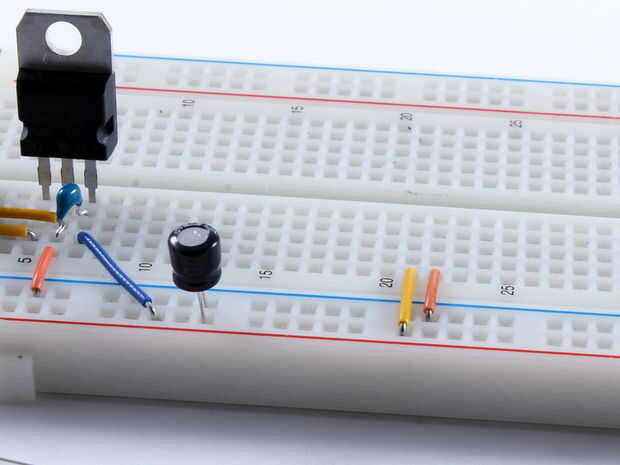 Para una luz de energía, basta encender el LED con los 5 voltios regulada por nuestro circuito. Aquí tenemos que conectar Pin 21 a 5 voltios y 22 Pin a tierra. Ahora sólo tenemos que añadir el LED y la resistencia para proteger el LED. LEDs tienen una polaridad.