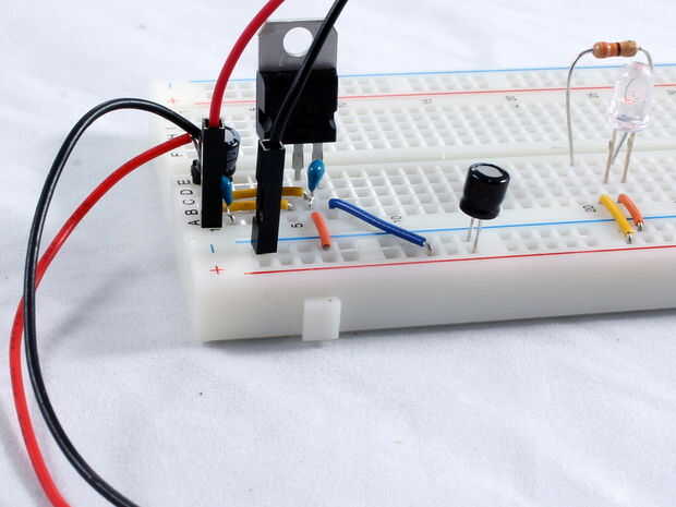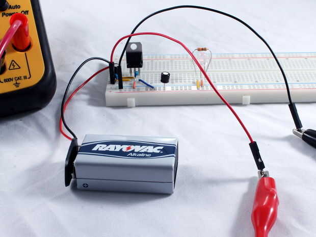 Para medir el voltaje con un multímetro, es necesario conectar el multímetro en paralelo con el circuito. Así que lo que hicimos anteriormente se agrega un par de cables de puente a la protoboard. El rojo se está conectado al pin 1 que es el mismo pin como el lado positivo de la batería. El otro está conectado a nuestro tren azul que está conectado con el lado negativo de la batería. Ahora podemos conectar un multímetro en modo de tensión a los cables de puente y medir el voltaje de la batería de 9 voltios nueva.
