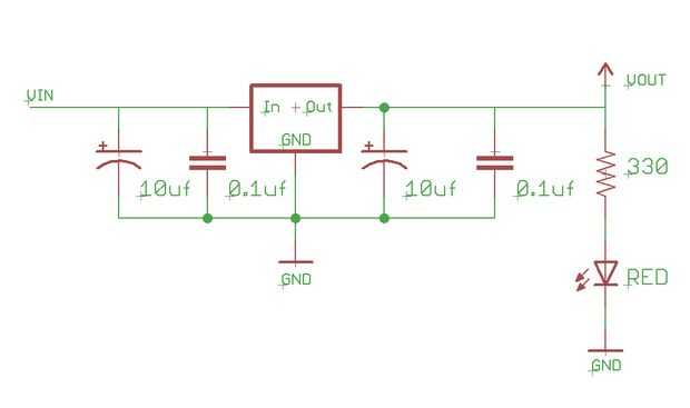 Aquí se encuentra nuestro circuito revisado; tenemos 4 condensadores en vez de 2 y han añadido nuestro poder que indica el LED rojo con una resistencia limitadora actual, que es necesaria para el LED, para que no se queme. Si estás preguntando de donde proviene el valor de resistencia de magia 330 ohm, es una simple aplicación de la V = IR ecuación. Primero obtenemos la caída de voltaje y los requisitos actuales para nuestro LED aquí. Tiene una caída de tensión de unos 3 voltios y dibuja 20 mA con su máximo brillo.