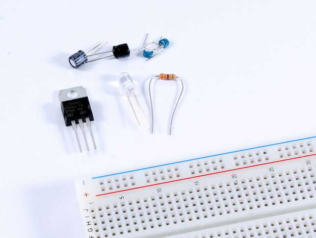 Así que ahora que ya tenemos bajar, vamos a llegar al edificio! Aquí están todas las piezas que vamos a utilizar para este tutorial. En la foto se puede ver el regulador de voltaje LM7805 3 pin, negro dos condensadores de uF 10, dos azules 0.1uf condensadores, un LED (lente claro con dos patas), una resistencia de 330 (la parte con los anillos de color naranja) y un tablero (tablero blanco con agujeros). Por último tenemos una pila de 9 voltiosy un conector. Yo he soldado algunos encabezados hasta el final, para que sea fácil de insertar en un protoboard.