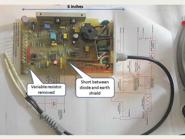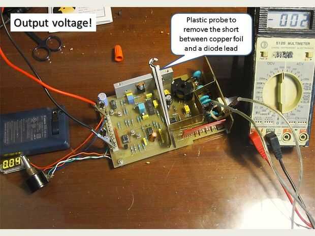 Algunos puntos en el circuito fueron mostrando un cortocircuito con la tierra, un cheque visual demostrado que el escudo de cobre estaba tocando uno del diodo conduce. He creado un espacio temporal con un plástico de la sonda (imagen 5) y tiene un voltaje de salida.