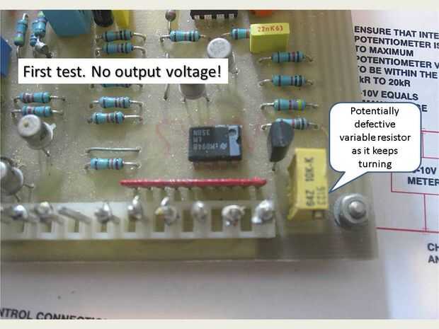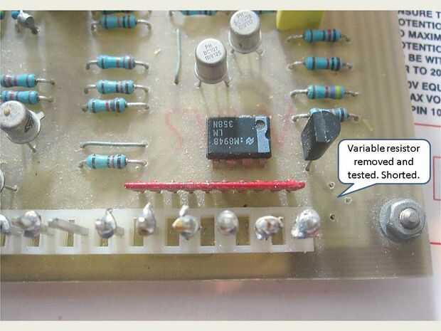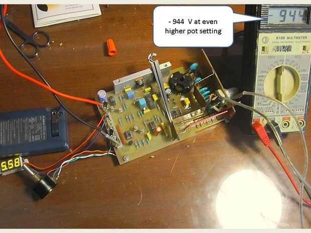Cuando conecté el módulo de alimentación HV (primera imagen), no vi ningún voltaje en el voltaje de seguimiento de pernos. Cambio de la resistencia variable (imagen 2) no cambió la tensión. El pequeño tornillo en la resistencia variable mantiene girando más de 10 o 15 revoluciones, lo que indica un defecto. Quité la variable resistencia y ohmiómetro mostraron un corto. Sustituido por un estándar pote de 10 k pero no el voltaje de control.