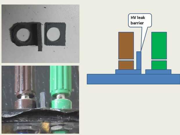 Me gusta utilizar postes que son el estándar 3/4 pulgada aparte pero no estaba seguro de qué tan seguro estos serían 1,5 kV así que creó una barrera de la chispa de una pequeña pieza de plástico en forma de L (última imagen).