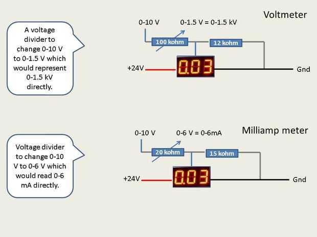Para los medidores de panel digitales tengo a escala 0-10 V control de voltaje para representar 0-1.5 KV y 0-6 mA.