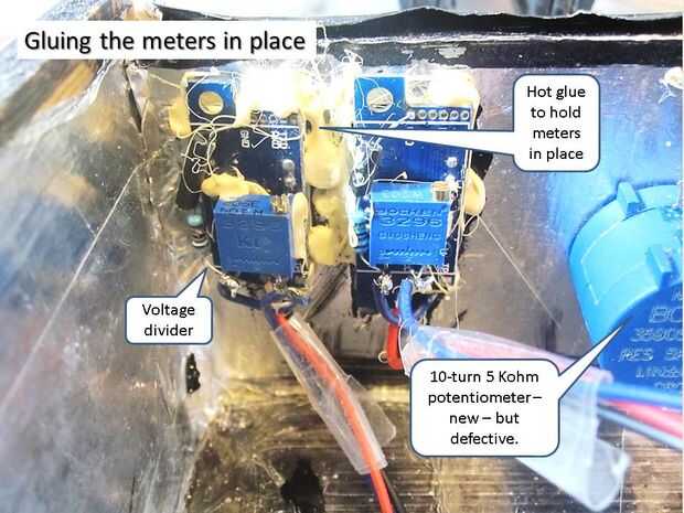 Caliente-pegado la resistencia variable a la parte posterior del medidor de voltios y luego soldar la resistencia fija en uno de los pines de la resistencia variable. El otro extremo de la resistencia fija fue a un agujero de tierra vacía en el voltímetro PCB. Entonces pegué estas asambleas pequeño voltímetro digital en el panel frontal. Fue difícil conseguir la boquilla de la pistola de pegamento en ese espacio apretado por lo tanto el empleo de pegamento sucio.