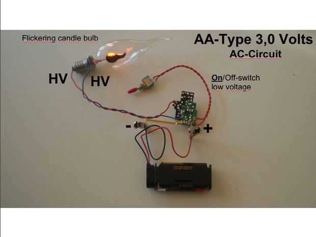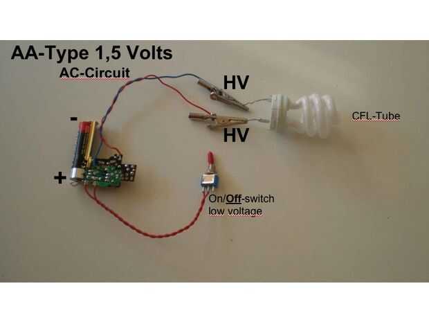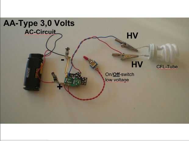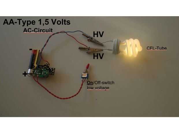 Usted puede conducir una clásico Bombilla vela parpadeante (llenada de gas neón) en un alta tensión-circuito de CA (un contacto antes de que el diodo) con 1,5 voltios así como un tubo de CFL ligtht.