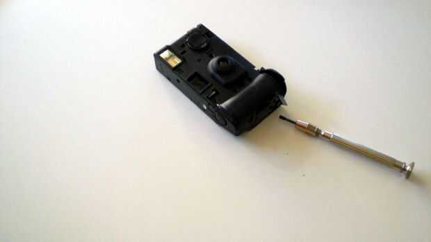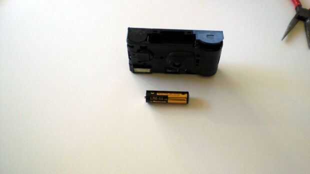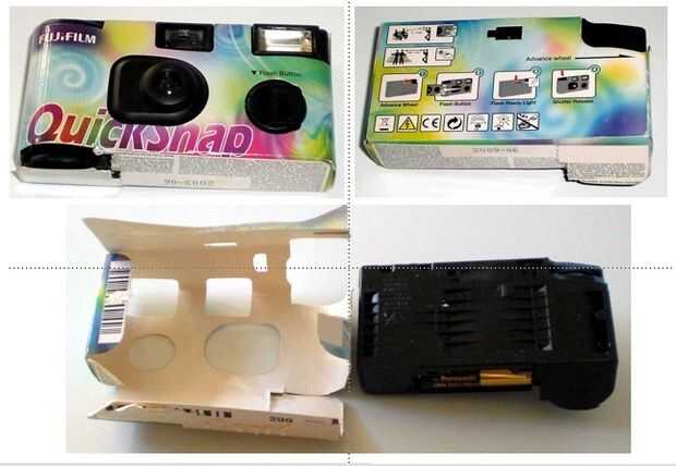 Primero tienes que cortar el papel. Luego abres la parte de plástico de la parte inferior de la camera´s a tomar la batería del AA hacia fuera y a continuación, abra la cámara cuidadosamente. Entonces usted puede sacar el electrónico fácilmente.