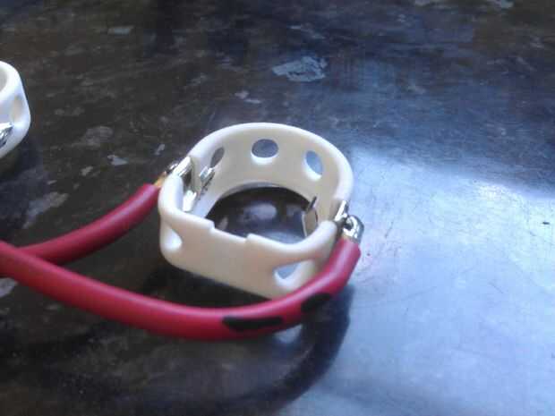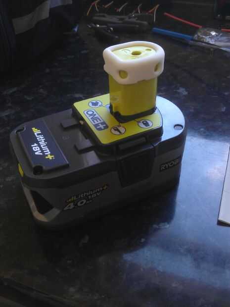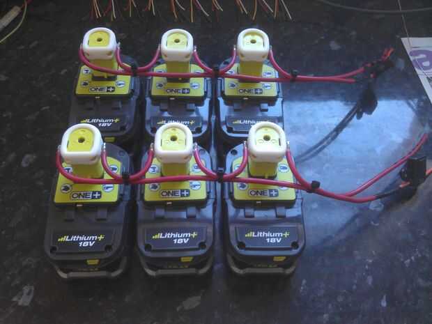 Después de recibir el 3D imprime piezas, era sólo una cuestión de empujar los clips contacto en cada tapa de las pilas y soldar los cables a los terminales. Necesitábamos a 50V, así conectamos 3 pilas en serie, 2 veces. Las tres baterías de 18V de serie proporcionan 54volts, entonces tenemos por cable que dos de estas baterías establece juntos en paralelo para aumentar las horas de amp.