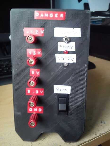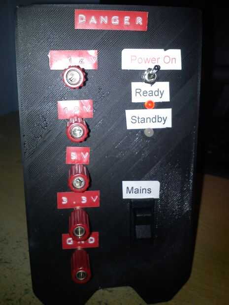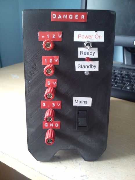 El final está a la vista. Ahora que ya tenemos todo atado con alambre para arriba y soldado podemos ponerlo juntos. Es tan simple como empujar el panel frontal a la fuente de alimentación. He diseñado para que sólo quede, por lo que esto requiere un poco de fuerza! También diseño en agujeros de los tornillos si no está lo suficientemente apretada como para usted. Ahora todo lo que queda por hacer ahora es probarlo. Agarra tu multímetro y vamos a ir. En primer lugar poner la sonda mulitmeter (negro) negativo en el post del enlace de Gnd, luego ir a través de todas las tensiones que a su vez asegurándose de que estén dentro del 5% de lo que deberían ser. Yo creo que es todo, me avisas si me olvido de nada. Espero que si usted los individuos deciden construir esto que tanta diversión y aprender tanto como lo hice.