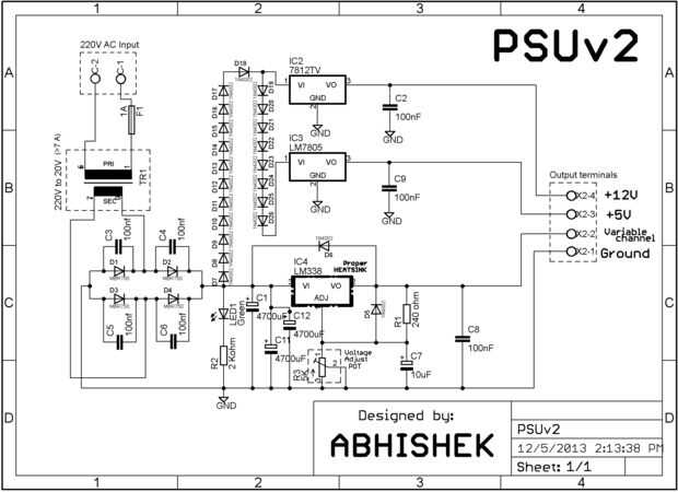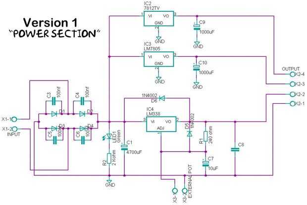 Se compone de un paso abajo transformador (TR1), cuatro diodes(D1-D4) 6A, regulador LM338(IC1), regulador LM7812(IC2), regulador LM7805 (IC3) y unos pocos componentes discretos.