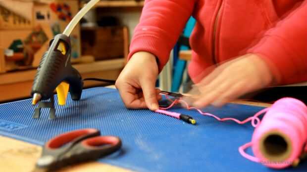 Ahora junté un par de cables con coletas a ambos lados para enchufar la unidad a cosas distintas de la energía, sin embargo para proteger los cables, pensé por qué no garantizar alguna línea mason, que pasa a ser rosa brillante con pegamento caliente. Y solo estoy agregando un poco de pegamento, girando la cuerda alrededor y así sucesivamente.