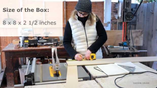 Las dimensiones finales de la caja mide 8 x 8 x 2 1/2 pulgadas tan solo cortando las piezas para.