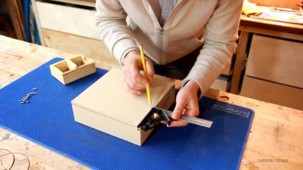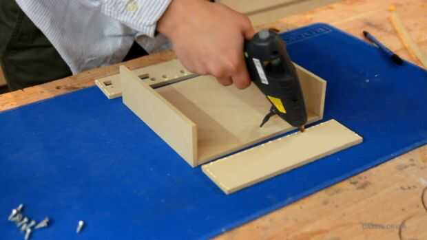 Ahora para armar la caja, estoy empezando con pegamento amarillo alrededor de los bordes, luego estoy agregando pequeñas cantidades de pegamento caliente en una sola pieza a la vez, porque endurece tan rápidamente para arriba, y esto básicamente actúa como una pinza hasta que se seque el pegamento amarillo. Funciona realmente bien. Y luego simplemente atornillando la tapa en su lugar.