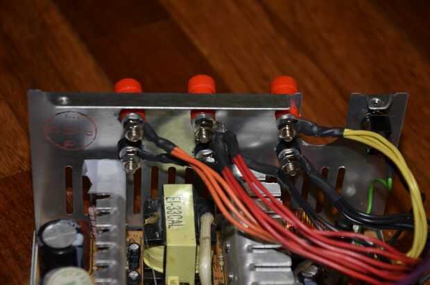 Separe los cables negro en 3 grupos, dejando a un lado un cable. La soldadura de los cables negros para los postes negros. Lo mismo para el resto de los cables, pero esta vez la soldadura de los cables de colores diferentes para sus respectivos bornes. El cable verde va a una terminal del interruptor y el cable negro pasado va a la otra terminal. Este será el interruptor para encender la fuente de alimentación. No se olvide de la diapositiva el encogimiento del calor de la tubería sobre los cables antes de soldar los cables, como tienes que desoldar los cables si se le olvida.