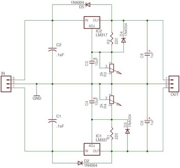 Estoy incluyendo un esquema de lo que estoy suministrando mi regulador con un circuito de ejemplo. Son posibles muchas variaciones. Llego a ser usando capacitores de 6800uF para C1 y C2 pero nada de 1500uF para arriba sería suficiente. El transformador que estoy usando es un 24 centro voltios uno aprovechado. Aquí otra vez se puede elegir un transformador con una tensión de salida más conveniente para el uso deseado. Voy a comentar esta parte del proyecto con más detalle en el paso 4. Así que si usted siente que necesita algo más de información para construir algo por sí mismo usted puede encontrar algunos allí.