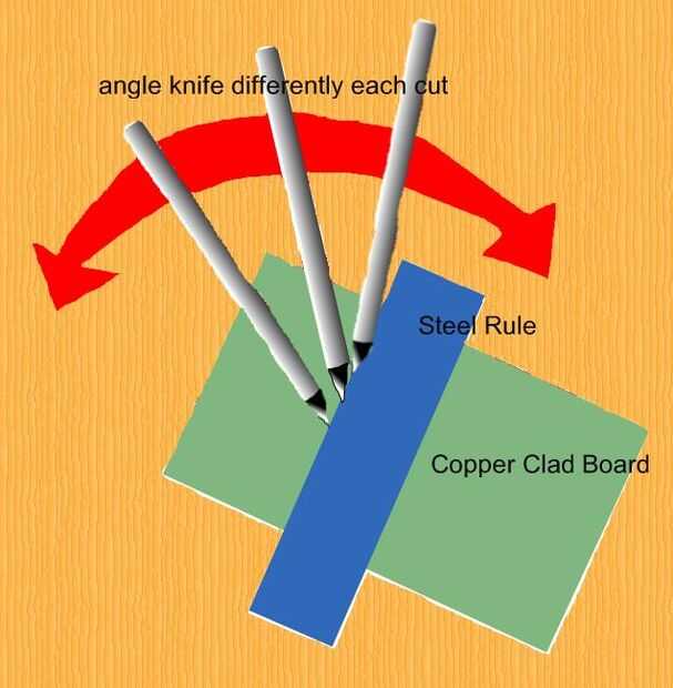 Esta vez he intentado algo completamente diferente. Usé un cuchillo de la manía y un borde recto acero para cortar un trozo de PCB. La técnica descubrí que lo mejor era el cuchillo hacia un lado diferente en relación perpendicular a borde recto acero con cada pasada hice un ángulo. Un poco difícil de describir con palabras así que hice un gráfico de lo que estoy tratando de difundir.