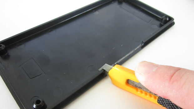 Para unir el conector a la caja, necesita primero cortar una ranura para él. Es más fácil hacerlo en el borde donde se reúnen las dos partes. Sujete el conector hasta el lado de la caja y marque los bordes. Entonces usando un cuchillo afilado, cortar a lo largo del contorno.