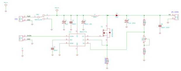 La magnitud del voltaje de la salida de la fuente de alimentación se establece mediante un divisor de tensión en la regeneración de la salida para el controlador de DC-DC. En el esquema de este divisor de tensión consiste en resistores R1, R3 y RV1. Utilizando los valores de estas resistencias el voltaje de salida de la fuente puede ser determinado mediante la fórmula Vout = Vref (R2 /(R3 + RV1) + 1) donde Vref tiene un valor de 1.5 V. Para este diseño usamos Resistores fijos para R2 y R3 con valores de 1M ohm y 15 k ohmios respectivamente. Seleccionamos un resistor variable con rango de 0-50 k ohmios para RV1. Conectar estos valores en la fórmula anterior da un rango de salida teórica de aproximadamente 25-100 V.