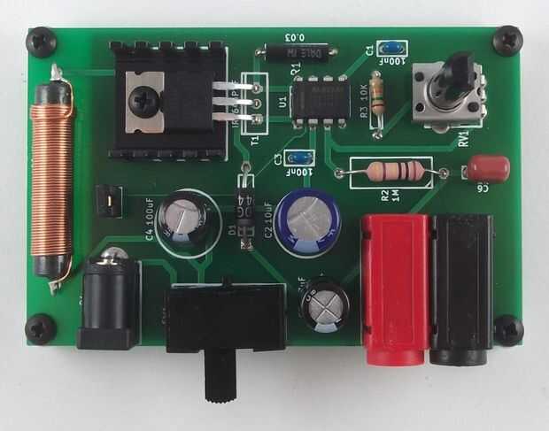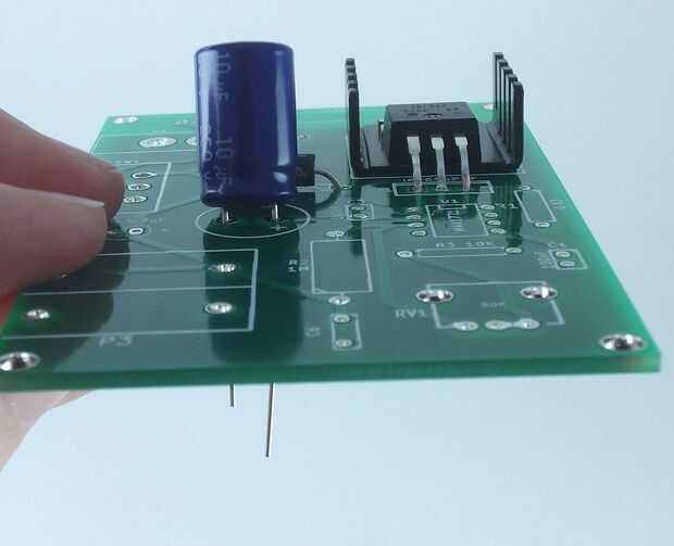 - T1 - disipador de calor y transistor. Coloque el disipador de calor sobre el PCB y doblar las patas del transistor para que pone plana sobre el disipador de calor con los agujeros alineados. Fije con el tornillo y la tuerca.