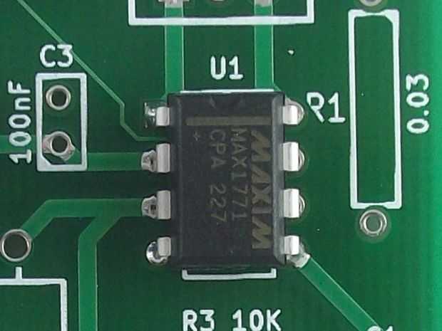 - U1 - controlador de MAX1771 DC-DC. Tenga en cuenta que este componente tiene una muesca en un extremo que se indica de una forma similar a la serigrafía para U1 ayudar a que Oriente la parte correctamente. Coloque el componente en el PCB, de modo que la muesca en la orientación correcta.