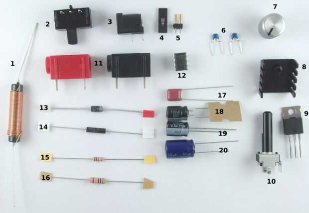 | 8 | * T1 | Disipador de calor | 18 | * C4 | Condensador: 100 uF, 50 V, polarizado |