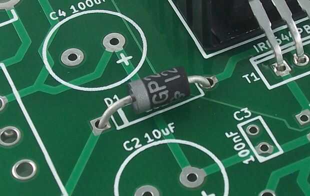 - D1 - diodo. La plata raya el diodo está indicada en la serigrafía por una línea que empareja. Oriente el diodo en el PCB para que la plata raya el diodo coincida con la orientación en la serigrafía.