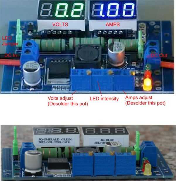 El módulo contiene el LM2596 chip, pantallas de LED de dos 3 dígitos que muestran los voltios y la corriente y tiene un muy pequeño factor de forma.