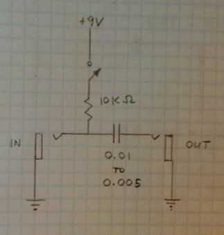 Aquí está el diagrama esquemático del circuito. El circuito en la parte posterior del paquete dice que use una resistencia de hasta 1k. Probé diferentes resistencias y decidió ir con 10k. La batería dura por días de uso continuo. Probablemente 10 veces más tiempo que usando un 1k y suena genial. Pondrá a prueba el tiempo de ejecución en una fecha posterior. Hay una gama de condensadores que funcionará. Cuanto menor sea la capacitancia de los agudos más llegar y obtener menos graves. Hice algunas pruebas con los condensadores como pequeñas como 0.001 uf y tan grande como 0..47 uf. Fui con 0.01 uf. Puede que desee experimentar con diferentes valores. Se establecieron en no es alta fidelidad pero alta claridad para hablar, pájaros y grillos (no graves y muchos agudos)...