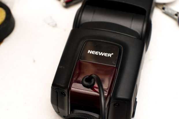 En primer lugar, encontrar una manera de conseguir el conector de alimentación a los terminales positivo y negativo para su alimentación. Puede tratar de recorte directamente sobre los terminales, crear espacios en blanco de la batería con cables en ellos, o puede hacer lo que hice y taladro recto a través del cuerpo flash y soldar los cables a los terminales de la batería. Si trata de un método similar a lo que hice, asegúrese de haber eliminado las baterías del flash antes de conectar la alimentación.