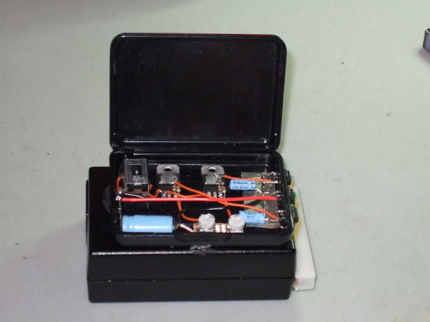 A continuación, puede poner el lm317 y filtro de caps en. Me hotmelt pegado a la caja antes de soldar con puentes. * Disclaimer - IC se calientan y probablemente derretir el pegamento bajo altas cargas. Pero dudo derretiría el plástico... y luego, otra vez, yo no soy un ingeniero eléctrico. Puede utilizar el protoboard para esta parte.