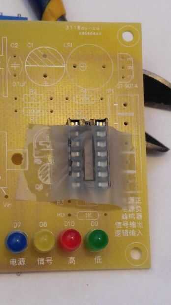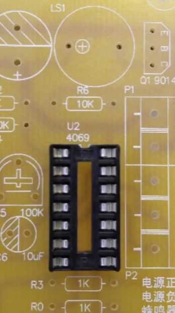 Hay un circuito integrado como parte de esta fuente de alimentación. Tiene 14 cortas, piernas del metal. Circuitos integrados son sensibles al calor por lo que no quieres soldar IC directamente en el tablero y potencialmente dañarlo, por lo que incluyeron una toma de corriente. Había soldado la toma siguiente. Las piernas están muy cerca juntos, así que asegúrese de no usar demasiada soldadura o podría salvar a través de la brecha y crear un corto circuito. Estaba soldadura por mí en este proyecto para que la toma de guardado caiga antes de pudiera terminar primer empalme de la soldadura. Por lo tanto, solía un trocito de cinta adhesiva transparente manténgalo en hasta el primer empalme de la soldadura fue hecho.