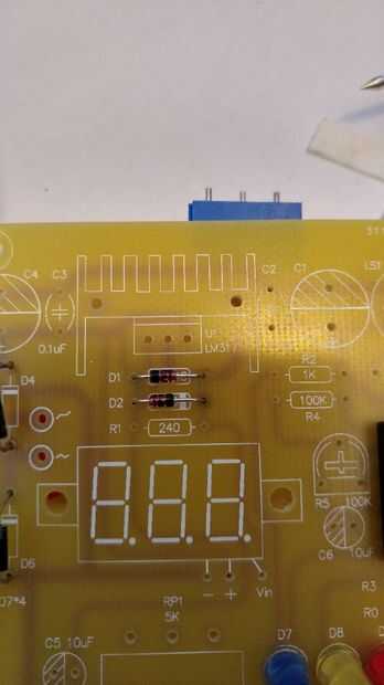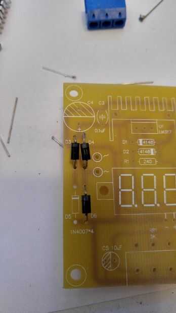 Los diodos son pequeñas y endecha plana contra la Junta, por lo que son un buen candidato para ir. Es muy importante que los diodos ir de la manera correcta. En el circuito, hay una línea blanca en un extremo. En el diodo, hay una línea de blanco/gris/negro en un extremo. Asegúrese de que las líneas estén alineadas. D3, D4, D5 y D6 enfrentan a la misma dirección. Pero D1 y D2 enfrentan a direcciones opuestas.